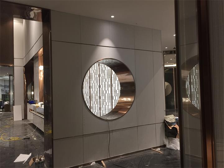 明鉑爾?不銹鋼團(tuán)隊(duì)嚴(yán)格安裝施工標(biāo)準(zhǔn)制作不銹鋼屏風(fēng)隔斷,整圓造型,波浪板吊頂制作安裝。